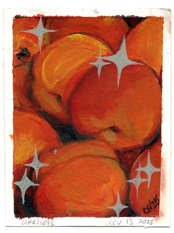 A jelly gouache painting of apricots. It is painted on cold press watercolor paper and measures 3x4 inches.