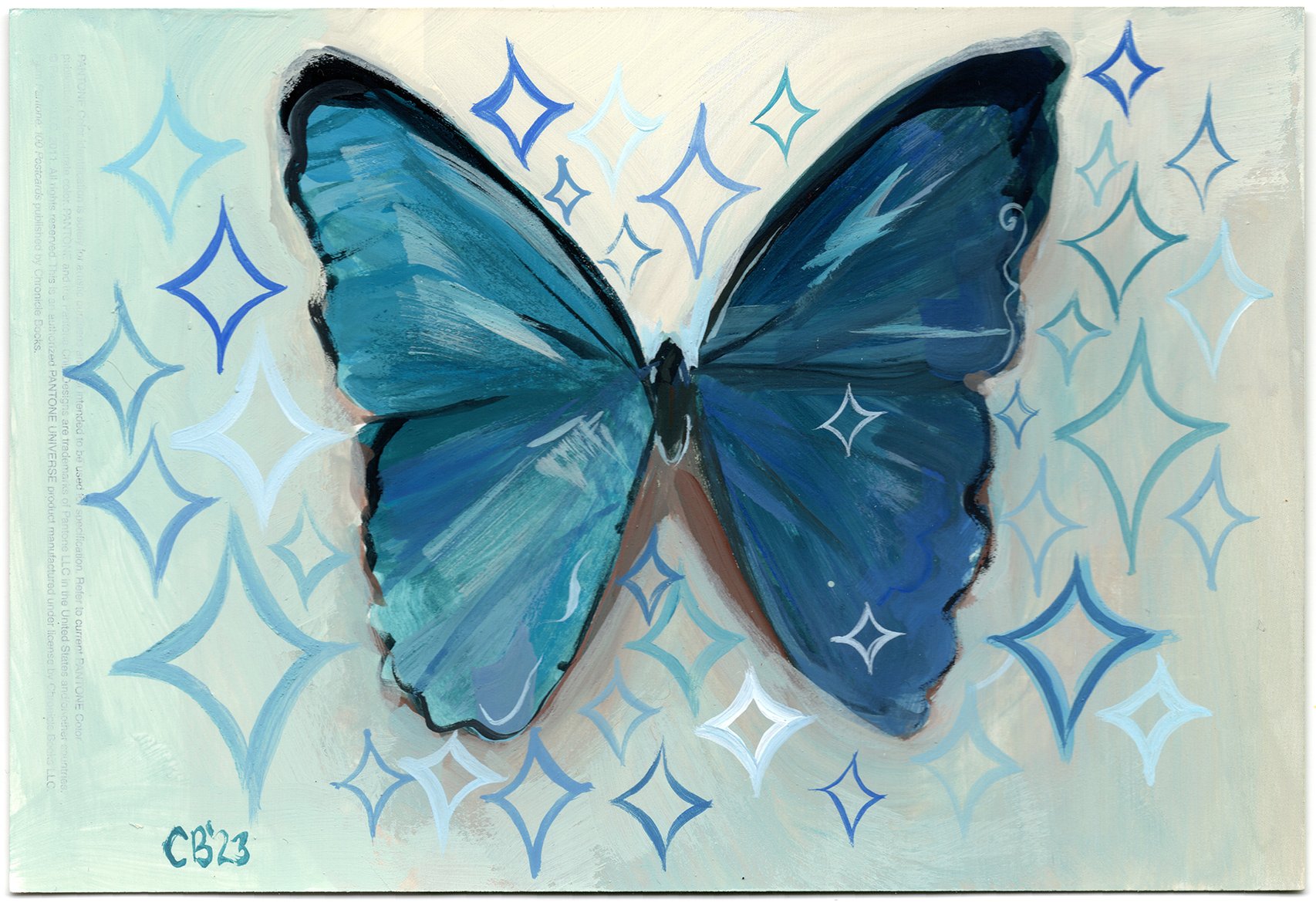 An acrylic gouache painting of a blue butterfly. It is painted on the blank side of a postcard and measures 14.2x9.7 cm.