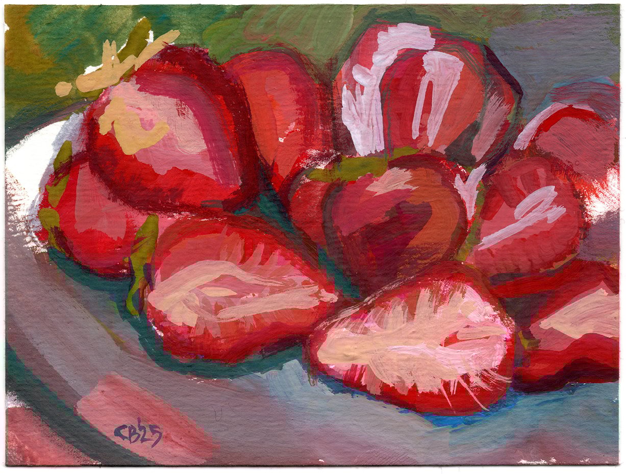 An acrylic gouache painting of cut strawberries on a plate. It is painted on cold press watercolor paper and measures 3x4 inches.
