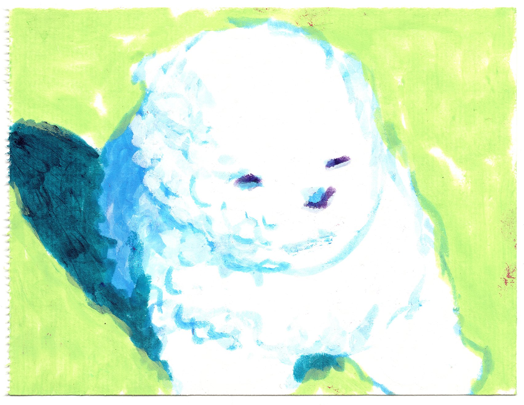 A painting of a little white dog, done in tempera paint sticks. It is painted on perforated postcard paper and measures 107x140 mm.
