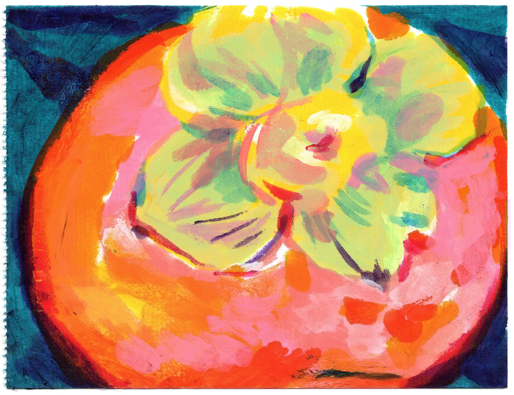 A painting of persimmons, done in tempera paint sticks. It is painted on perforated postcard paper and measures 107x140 mm.