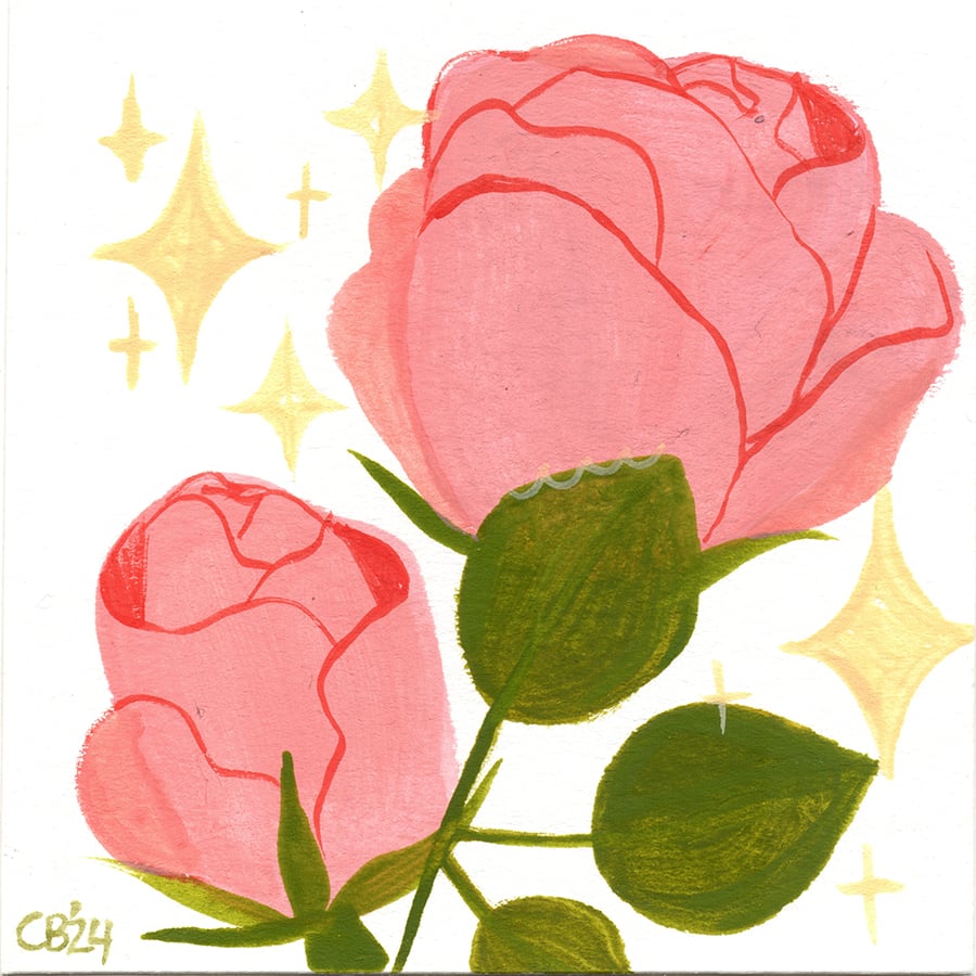 A jelly gouache painting of pink roses. It is painted on cold press watercolor paper and measures 3x3inches.