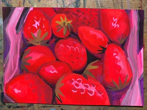 An acrylic gouache painting of vibrantly red strawberries in white boxes. It is painted on the blank side of a postcard and measures 14.3x9.7 cm.