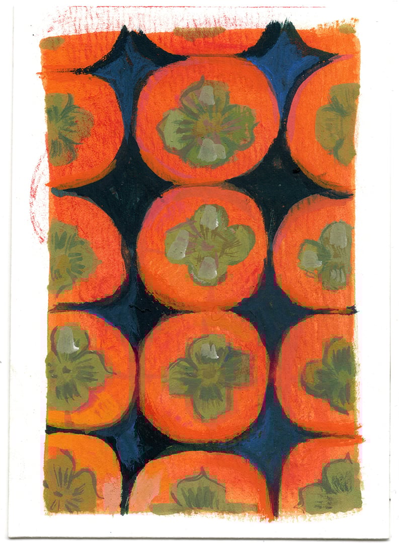 An acrylic gouache painting of persimmons. It is painted on cold press watercolor paper and measures 2.5x3.5 inches.