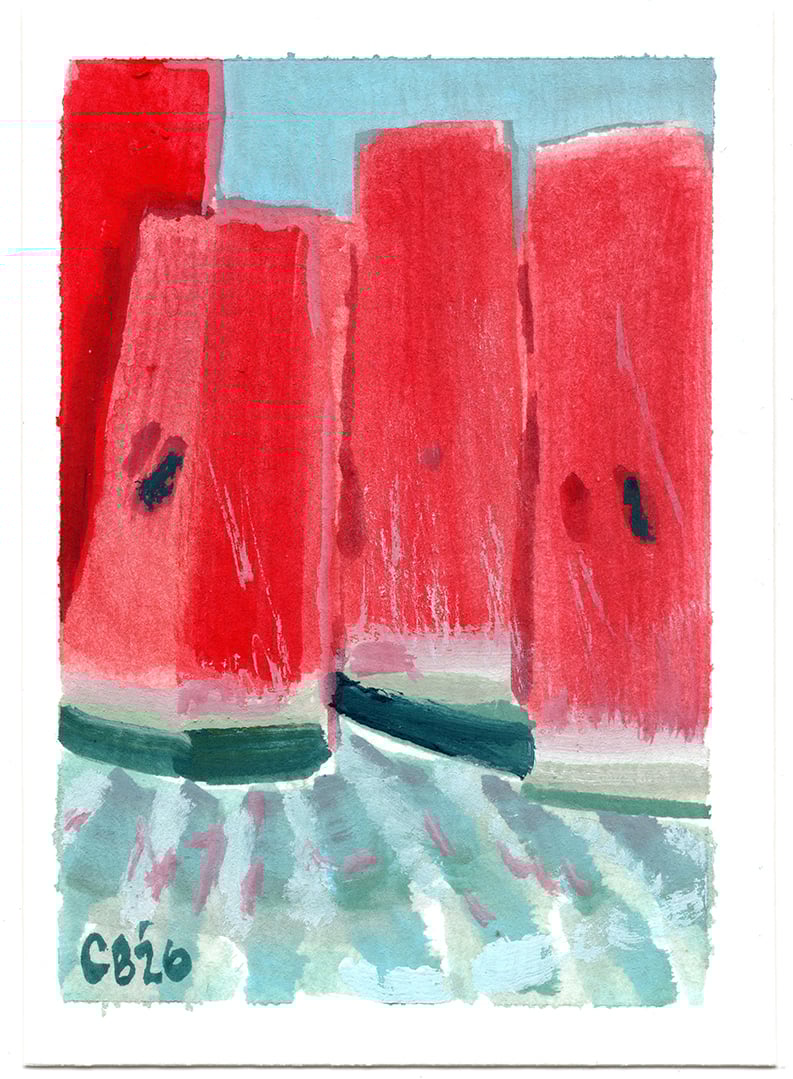 An acrylic gouache painting of sliced watermelon. It is painted on cold press watercolor paper and measures 2.5x3.5 inches.