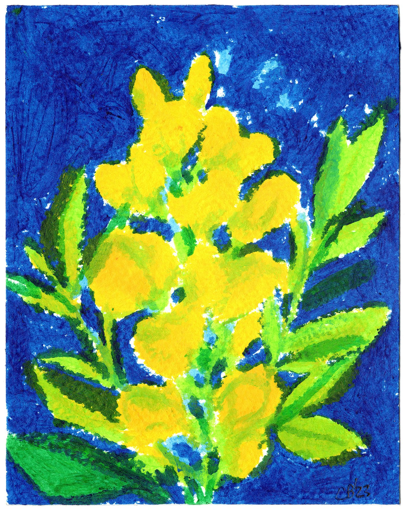 A painting of bright yellow pea flowers on a pure blue background, done in tempera paint sticks. The painting is on canson cold press watercolor paper and measures 4.5x5.75 in.